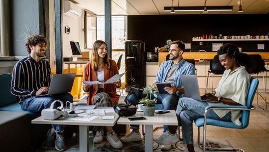 Young Gen Z entrepreneurs working in a co-working space with laptops and mobile devices, symbolizing digital economy leadership in 2025.